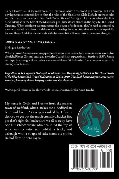 At the Blue Lotus Club pleasure is paramount, but someone has to keep the Flower Girls in line… To be a Flower Girl at the most exclusive Gentleman's club in the world, is a privilege. But with privilege comes responsibility, a responsibility to obey the rules of the Blue Lotus Club. Default on the rules and there are consequences to face. Boris Pavlov, General Manager of the Blue Lotus Club, rules his domain with a firm hand. Along with the help of the Mistresses, punishments are plenty on the day after the Grand Opening. When confident women master the power of seduction, they're hard to control. A meeting is called to address the defaulters on breaking the rules. Surprises are in store especially for one Flower Girl, but the day ends with the event that will leave their lives forever changed. This is the second book in the Flower Girl Series, indulge today and escape to the Blue Lotus Club – where wildest dreams do come true. ~BONUS SHORT STORY INCLUDED~ Midnight Rendezvous When a French Count makes an appointment at the Blue Lotus, Boris needs to make sure he has the right Flower Girl and setting to meet the Count's high expectations… Step into 1930's France and experience a night like no other when a new Flower Girl takes the Count on an unforgettable journey of seduction. Defaulters at Ten together Midnight Rendezvous was Originally published as The Flower Girls of the Blue Lotus Club Grand Defaulters at Ten in 2019. This book has undergone some major rewrites; however, the underlying stories remains the same. Warning: All stories in the Flower Girls series are written for the Adult Reader and contain bad language, violence and not forgetting scenes of a sexual nature. ¿¿¿¿¿¿