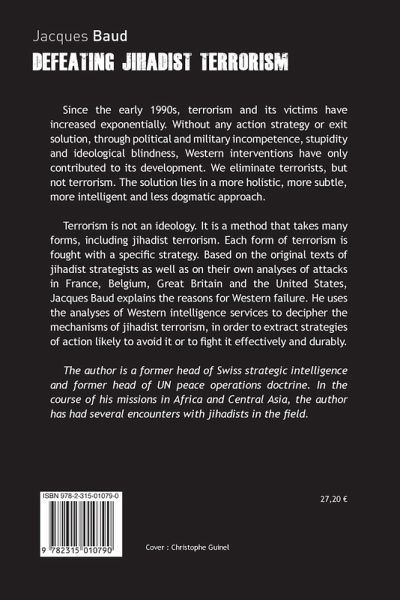 Since the early 1990s, terrorism and its victims have increased exponentially. Without any action strategy or exit solution, through political and military incompetence, stupidity and ideological blindness, Western interventions have only contributed to its development. We eliminate terrorists, but not terrorism. The solution lies in a more holistic, more subtle, more intelligent and less dogmatic approach.Terrorism is not an ideology. It is a method that takes many forms, including jihadist terrorism. Each form of terrorism is fought with a specific strategy. Based on the original texts of jihadist strategists as well as on their own analyses of attacks in France, Belgium, Great Britain and the United States, Jacques Baud explains the reasons for Western failure. He uses the analyses of Western intelligence services to decipher the mechanisms of jihadist terrorism, in order to extract strategies of action likely to avoid it or to fight it effectively and durably.