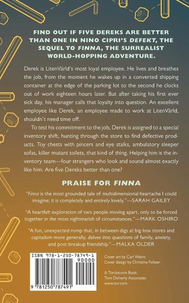Winner of the British Fantasy Award! Nominated for the Philip K. Dick Award! Find out if five Dereks are better than one in Nino Cipri's Defekt, the sequel to Finna, the surrealist world-hopping adventure. Derek is LitenVärld's most loyal employee. He lives and breathes the job, from the moment he wakes up in a converted shipping container at the edge of the parking lot to the second he clocks out of work 18 hours later. But after taking his first ever sick day, his manager calls that loyalty into question. An excellent employee like Derek, an employee made to work at LitenVärld, shouldn't need time off. To test his commitment to the job, Derek is assigned to a special inventory shift, hunting through the store to find defective products. Toy chests with pincers and eye stalks, ambulatory sleeper sofas, killer mutant toilets, that kind of thing. Helping him is the inventory team - four strangers who look and sound almost exactly like him. Are five Dereks better than one?