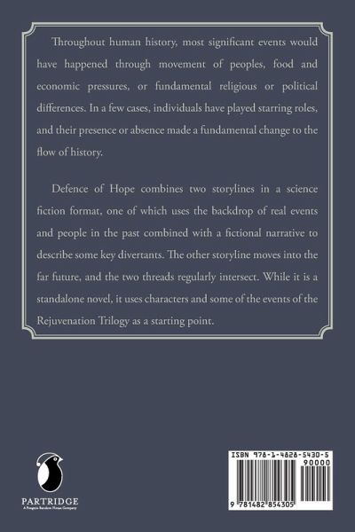 Throughout human history, most significant events would have happened through movement of peoples, food and economic pressures, or fundamental religious or political differences. In a few cases, individuals have played starring roles, and their presence or absence made a fundamental change to the flow of history. Defence of Hope combines two storylines in a science fiction format, one of which uses the backdrop of real events and people in the past combined with a fictional narrative to describe some key divertants. The other storyline moves into the far future, and the two threads regularly intersect. While it is a standalone novel, it uses characters and some of the events of the Rejuvenation Trilogy as a starting point.