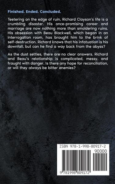 Finished. Ended. Concluded. Teetering on the edge of ruin, Richard Clayson's life is a crumbling disaster. His once-promising career and marriage are now nothing more than smoldering ruins. His obsession with Beau Blackwell, which began in an interrogation room, has brought him to the brink of self-destruction. Richard knows that his infatuation is his downfall, but can he find a way back from the abyss? As the dust settles, there are no clear answers. Richard and Beau's relationship is complicated, messy, and fraught with danger. Is there any hope for reconciliation, or will they always be bitter enemies?