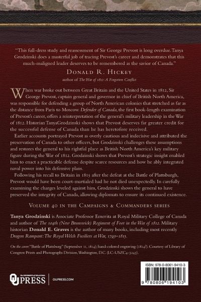 When war broke out between Great Britain and the United States in 1812, Sir George Prevost, captain general and governor in chief of British North America, was responsible for defending a group of North American colonies that stretched as far as the distance from Paris to Moscow. He also commanded one of the largest British overseas forces during the Napoleonic Wars. Defender of Canada, the first book-length examination of Prevost's career, offers a reinterpretation of the general's military leadership in the War of 1812. Historian Tanya Grodzinski shows that Prevost deserves far greater credit for the successful defense of Canada than he has heretofore received. Earlier accounts portrayed Prevost as overly cautious and attributed the preservation of Canada to other officers, but Grodzinski challenges these assumptions and restores the general to his rightful place as British North America's key military figure during the War of 1812. Grodzinski shows that Prevost's strategic insight enabled him to enact a practicable defense despite scarce resources and to ably integrate naval power into his defensive plans. Prevost's range of responsibilities in British North America were daunting. They included overseeing joint endeavors with Indian allies, managing logistical matters, monitoring naval construction and personnel needs, supervising colonial governments, and commanding the defense of Canada. Tasked with protecting an extensive and complex territory, Prevost employed a mix of soldiers, sailors, locally raised forces, and indigenous people in taking advantage of the American military's weaknesses to defeat most of its plans. Following his recall to Britain in 1815 after the defeat at the Battle of Plattsburgh, Prevost would have been court-martialed had he not died unexpectedly. In carefully examining the charges leveled against Prevost, Grodzinski shows the general to have preserved the integrity of Canada, allowing diplomats to ensure its continued existence.