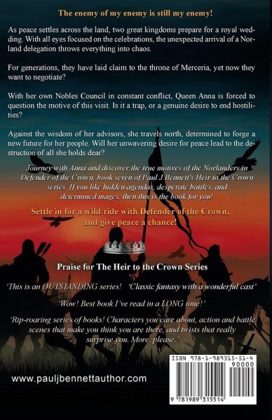 The enemy of my enemy is still my enemy! As peace settles across the land, two great kingdoms prepare for a royal wedding. With all eyes focused on the celebrations, the unexpected arrival of a Norland delegation throws everything into chaos. For generations, they have laid claim to the throne of Merceria, yet now they want to negotiate? With her own nobles council in constant conflict, Queen Anna is forced to question the motive of this visit. Is it a trap, or a genuine desire to end hostilities? Against the wisdom of her advisors, she travels north, determined to forge a new future for her people. Will her unwavering desire for peace lead to the destruction of all she holds dear? Journey with Anna and discover the true motives of the Norlanders in Defender of the Crown, book seven of Paul J Bennett's Heir to the Crown series. If you like hidden agendas, desperate battles, and determined mages, then this is the book for you! Settle in for a wild ride with Defender of the Crown, and give peace a chance! New to the series? Meet Gerald Matheson, the steadfast warrior in Servant of the Crown, Heir to the Crown: Book One, available in eBook, Audiobook, and Paperback. Books in this series: Servant of the Crown Mercerian Tales: Stories of the Past Heart of the Crown Shadow of the Crown Mercerian Tales: The Call of Magic Fate of the Crown Burden of the Crown Mercerian Tales: The Making of a Man Defender of the Crown Other Series by Paul J Bennett: The Frozen Flame The Chronicles of Cyric Power Ascending