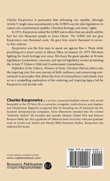 Charles Kacprowicz is persuaded that defending our republic (through Article V single-issue amendments) is the LORD's way for state legislatures to restore our constitutional republic, Christian heritage, and states' rights. In 1971, Kacprowicz asked the LORD not to allow him see death until he had led one thousand people to Jesus Christ. The LORD did not give Kacprowicz one thousand souls. He gave him ninety thousand in seventy-four nations. Kacprowicz was the first man to speak out against Roe v. Wade while preaching on a street corner in Akron, Ohio, on January 23, 1973. He's been fighting for God's heritage ever since. He's been the guest speaker at 38 state legislatures (committees, caucuses, and special legislative events) promoting the Article V Unborn Child and Countermand Amendments. Defenders of the Unborn, Winners of Souls, Christian Patriots delves into the inspiring sixty-five-year journey of faith, resilience, and unwavering commitment to principles that define the lives of extraordinary individuals. Join us on a compelling exploration of the enduring and inspiring legacy left by Kacprowicz and his late wife.