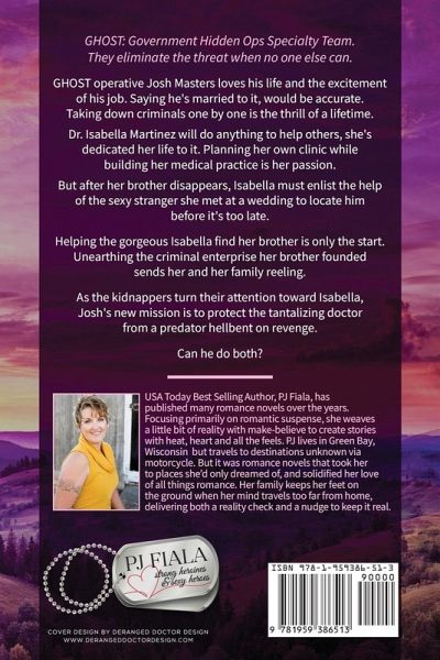 GHOST: Government Hidden Ops Specialty Team. They eliminate the threat when no one else can. GHOST operative Josh Masters loves his life and the excitement of his job. Saying he's married to it, would be accurate. Taking down criminals one by one is the thrill of a lifetime. Dr. Isabella Martinez will do anything to help others, she's dedicated her life to it. Planning her own clinic while building her medical practice is her passion. But after her brother disappears, Isabella must enlist the help of the sexy stranger she met at a wedding to locate him before it's too late. Helping the gorgeous Isabella find her brother is only the start. Unearthing the criminal enterprise her brother founded sends her and her family reeling. As the kidnappers turn their attention toward Isabella, Josh's new mission is to protect the tantalizing doctor from a predator hellbent on revenge. Can he do both? *** Entire series complete! USA Today bestselling author PJ Fiala brings you the full and complete GHOST series-heroes willing to sacrifice everything in service to their country, and for the women they love. Full length novel with no cliffhanger, no cheating, and a happily-ever-after guaranteed.