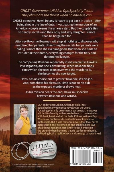 GHOST: Government Hidden Ops Specialty Team. They eliminate the threat when no one else can. ¿ GHOST operative, Hawk Delany is ready to get back in action--after being shot in the line of duty. Investigating the murders of an American couple seems like an easy start. But the couple's ties to deadly secrets and their nosy and sexy daughter is more than he bargained for. Attorney Roxanne Bowman will stop at nothing to discover who murdered her parents. Unearthing the secrets her parents were hiding is more than she ever imagined. But when she finds an intruder in their home, everything changes for the fiery and determined lawyer. The compelling Roxanne repeatedly inserts herself in Hawk's investigation, and she's distracting. When Roxanne finds clues which she uses to uncover who the murderer is, she becomes the new target. Hawk has no choice but to protect Roxanne, it's his job. And, somehow, his pleasure. Time is not on his side as the exposed murderer draws near. As his mission nears the end, Hawk must decide between Roxanne and GHOST. *** Entire series complete! USA Today bestselling author PJ Fiala brings you the full and complete GHOST series-heroes willing to sacrifice everything in service to their country, and for the women they love. Full length novel with no cliffhanger, no cheating, and a happily-ever-after guaranteed.
