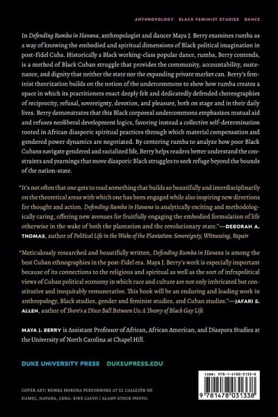 In Defending Rumba in Havana, anthropologist and dancer Maya J. Berry examines rumba as a way of knowing the embodied and spiritual dimensions of Black political imagination in post-Fidel Cuba. Historically a Black working-class popular dance, rumba, Berry contends, is a method of Black Cuban struggle that provides the community, accountability, sustenance, and dignity that neither the state nor the expanding private market can. Berry's feminist theorization builds on the notion of the undercommons to show how rumba creates a space in which its practitioners enact deeply felt and dedicatedly defended choreographies of reciprocity, refusal, sovereignty, devotion, and pleasure, both on stage and in their daily lives. Berry demonstrates that this Black corporeal undercommons emphasizes mutual aid and refuses neoliberal development logics, favoring instead a collective self-determination rooted in African diasporic spiritual practices through which material compensation and gendered power dynamics are negotiated. By centering rumba to analyze how poor Black Cubans navigate gendered and racialized life, Berry helps readers better understand the constraints and yearnings that move diasporic Black struggles to seek refuge beyond the bounds of the nation-state.