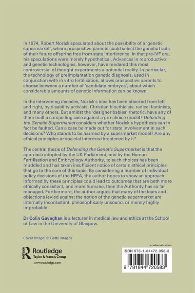 The controversial topic of the technology of Pre-implantation Genetic Diagnosis, and the muddled approach to this subject adopted by the UK Parliament, is explored in detail in this volume. The author takes the viewpoint that the HFEA has taken insufficient notice to date of certain core ethical principles and makes the case for a much more ethically consistent and humane system than has been managed so far. Arguing that many of the fears and objections levied against Robert Nozick's notion of the 'Genetic Supermarket' by disability activists, christian bioethicists and radical feminists, amongst others, are internally inconsistent, philosophically unsound or merely highly improbable, the author considers a number of individual policy decisions of the HFEA and addresses such questions as: Can a case be made out for state involvement in such decisions? Who stands to be harmed by a supermarket model? Are any ethical principles or societal interests threatened by it? This book is an essential resource for law students of all levels and professionals working within or interested in medical and healthcare law and medical genetics.