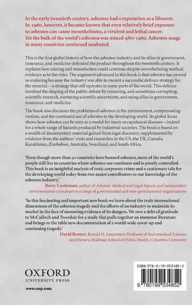 Until the mid-1960s, asbestos had a reputation as a lifesaver. In 1960, it became known that exposure to asbestos can cause mesothelioma, a virulent and lethal cancer. Yet the bulk of the world's asbestos was mined after 1960. This is the first global history of how the asbestos industry defended the product throughout the 20th century.
