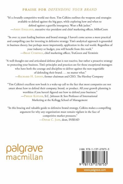 "It's a brutally competitive world out there. Tim Calkins outlines the weapons and strategies available to defend against the big guys, while exploring how and when to defend against a guerilla insurgency. Wear a flak jacket." - Andy England, Executive Vice President and Chief Marketing Officer, MillerCoors "A well thought-out and articulated defense plan is not reactive, but rather a proactive strategy to protecting your business. Tim's principles and practices are for those exceptional managers who have both the courage and discipline to deliver against the non-negotiable of defending their brand . . . no matter what." - Richard H. Lenny, Former Chairman & CEO, The Hershey Company "In tough times, the best offense is often a good defense. That's what makes this book so interesting and relevant." - Dr. John A. Quelch CBE, Distinguished Professor of International Management, Vice President and Dean, CEIBS "Tim Calkins excellent new book is a wake-up call to the fact that most companies are not smart about how to defend their company, brand or product. All your growth planning is worthless if you haven't figured out how to defend your business." - Philip Kotler, S.C. Johnson & Son Professor of International Marketing, Kellogg School of Management "In this bracing and valuable guide to defensive brand strategy, Calkins makes a compelling argument for why any organization must remain vigilant in the face of competitive market pressures." - Dipak C. Jain, Dean, INSEAD "Defending Your Brand takes an innovative look at an often neglected aspect of marketing strategies, how to defend a firm's competitive advantage which has come under attack. Calkins' use of many illustrative case studies and his to-the-point writing style makes this book relevant and fun to read for managers." - Prof. Dr. Holger Ernst, WHU,Otto Beisheim School of Management "Defending Your Brand provides powerful insight into successful brands that win despite an increasingly competitive global environment. This guide provides strategies and actions that fit the tough realities of defending a valuable brand against determined competition. Whether you are preparing for a competitive entry or planning to take on an established brand, Defending Your Brand is a must read." - Chuck Raup,Vice President / General Manager, U.S. Sugar, The Hershey Company "In over 25 years leading business and brand strategy, I haven't come across a more practical and compelling case for investing in defensive strategy. Tim's analytical approach is grounded in business theory, but perhaps more importantly, application in the real world. Regardless of your industry or budget, you will benefit from this work." - Brad Cumings, Chief Marketing Officer, TruGreen and Terminix "Calkins has written a valuable management reference, illuminating the usually hidden but critical arts of effective defense.This worthy guide, brought to life with robust case examples, warrants readingby every manager who wants tosucceed amidstthe disruptive competitive forcesof our capitalist system." - M. Carl Johnson III, Executive Vice President, Brands, Del Monte Foods "A must read for marketers, Calkins' book offers strategic and tactical wisdom on how to deal with ever-increasing competition. While we all tend to concentrate on offense (increased sales and market share) 'Defending Your Brand' focuses on an equally important but often overlooked marketing aspect, defense (defending your brand and protecting market share). I'm buying a copy for each member of my staff." - Rob Gallas, Vice President, Chief Marketing Officer, Museum of Science and Industry "Creating a brand is hard work, but establishing a brand and maintaining its relevance is even more important. Understanding how to defend your brand against the competition is the difference between long term success and short term failure. Calkins shows how to keep brands on top by countering competitors' attacks." - Daniel Hamburger, President & CEO, DeVry Inc. "This is a great read for any marketing leader. Defending Your Brand outlines practical strategies for brand management in a focused manner, backed by relevant and compelling case studies. You'll walk away with applicable ideas for your business." - Conrad York, Vice President Marketing, Northwestern Mutual "The purpose of any writing on brand management is to provoke a thoughtful debate on strategy and the resulting actions. Professor Calkins' discussions on defensive strategies deliver on that purpose." - Kevin Newell, Executive Vice President and Global Chief Brand Officer, McDonald's Corporation "Insightful, provocative and inspiring, this book provides a prism for executives and entrepreneurs to challenge even the most focused business strategies. Full of illustrative examples, we found ourselves preparing to fall into traps that we will now avoid. Tim nails it!" - E Douglas Grindstaff II, CEO, NuSirt Sciences, Inc. "This book will be put to use immediately, whether you are driving out your annual operating plan, your five year strategic plan or helping your sales force win in the trenches tomorrow. As a result of this timely and well-crafted book, when companies' are crafting their long-range strategic growth plans, defensive strategy will now get the attention it has long deserved." - Scott M. Davis, Chief Growth Officer, Prophet