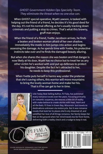 GHOST: Government Hidden Ops Specialty Team. They eliminate the threat when no one else can. When GHOST special operative, Wyatt Lawson, is tasked with helping out the friend of a friend, he decides it's his good deed for the day. It's not his normal offering as he's usually tracking down criminals and putting a stop to crimes. That's what this brawny, gruff man enjoys. When the friend of a friend, Yvette Jacobson arrives, he finds a beaten and broken woman afraid of her own shadow. Immediately the medic in him jumps into action and begins assessing the damage. As he spends time with Yvette, his protective instincts take over and he finds the damaged beauty alluring. But when she shares the reason she was beaten and that danger is now likely at his door, Wyatt has no choice but to treat her as any other victim he's worked with and put up defenses to protect his daughter. Despite the fact he's attracted to her, he needs to keep this professional. When Yvette puts herself in harms way under the pretense that she's saving others, this warrior will move mountains to bring the lovely woman home and make her his. That is if he can get to her in time. *** Entire series complete! USA Today bestselling author PJ Fiala brings you the full and complete GHOST series-heroes willing to sacrifice everything in service to their country, and for the women they love. Full length novel with no cliffhanger, no cheating, and a happily-ever-after guaranteed.