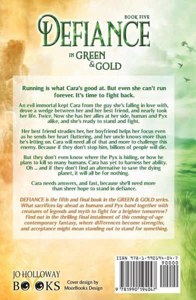Running is what Cara's good at. But even she can't run forever. It's time to fight back. An evil immortal kept her from the guy she's falling in love with, drove a wedge between her and her best friend, and nearly took her life. Twice. Now she has her allies at her side, human and Pyx alike, and she's ready to fight. Her best friend steadies her, her boyfriend helps her focus even as he sends her heart fluttering, and her uncle knows more than he's letting on. Cara will need all of that and more to challenge Messoryx. Because if they don't stop him, billions of people will die. But they don't even know where he's hiding, or how he plans to kill so many humans. Cara has yet to harness her ability to stop his followers. Oh ... and if they don't find an alternative to save the dying planet, it will all be for nothing. Cara needs to find some answers, and fast, because she's going to need more than sheer hope to stand up and fight. DEFIANCE is the fifth and final book in the GREEN & GOLD series (and should be read following DAYBREAK). What sacrifices await as humans and Pyx band together with creatures of legends and myth to fight for a brighter tomorrow? Find out in the thrilling final instalment of this coming-of-age contemporary fantasy, where differences become strengths, and acceptance might mean standing out to stand for something.