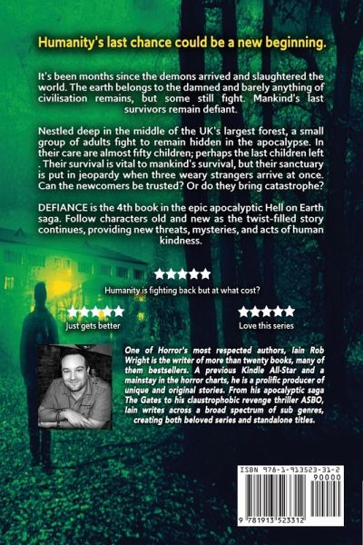 It's been months since the demons arrived and slaughtered the world. The earth belongs to the damned and barely anything of civilisation remains, but some still fight. Mankind's last survivors remain defiant. Nestled deep in the middle of the UK's largest forest, a small group of adults fight to remain hidden in the apocalypse. In their care are almost fifty children; perhaps the last children left . Their survival is vital to mankind's survival, but their sanctuary is put in jeopardy when three weary strangers arrive at once. Can the newcomers be trusted? Or do they bring catastrophe? DEFIANCE is the 4th book in the epic apocalyptic Hell on Earth saga. Follow characters old and new as the twist-filled story continues, providing new threats, mysteries, and acts of human kindness.