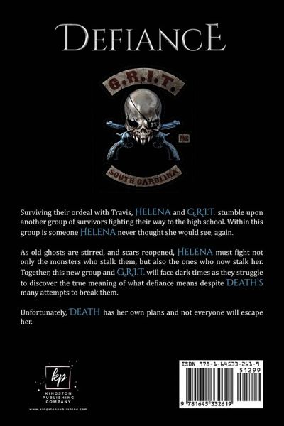 Surviving their ordeal with Travis, Helena and G.R.I.T. stumble upon another group of survivors fighting their way to the high school. Within this group is someone Helena never thought she would see, again. As old ghosts are stirred, and scars reopened, Helena must fight not only the monsters who stalk them, but also the ones who now stalk her. Together, this new group and G.R.I.T will face dark times as they struggle to discover the true meaning of what defiance means despite Death's many attempts to break them. Unfortunately, Death has her own plans and not everyone will escape her.