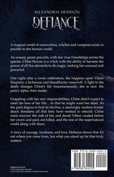 A magical world of werewolves, witches and vampires exists in parallel to the human world. An uneasy peace prevails, with few true friendships across the species. Chloe Rowan is a witch with the ability to harness the power of all five elements to do magic, making her unusual and powerful. One night after a coven celebration, she happens upon Viktor Rasputin, a lecherous and bloodthirsty werewolf. A fight to the death changes Chloe's life instantaneously; she is now the pack's alpha, their leader. Grappling with her new responsibilities, Chloe didn't expect to meet the love of her life... or that he might want her dead. As the pack begins to find its rhythm, a seemingly random border attack threatens all that they have worked to rebuild. Chloe must uncover the web of lies and deceit Viktor created before her coven and pack are killed, and the rest of the supernatural world along with them. A story of courage, kindness, and love, Defiance shows that it's not where you come from, but what you stand up for that truly matters.
