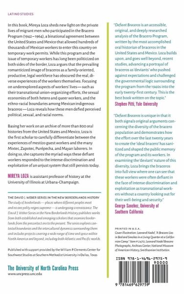 In this book, Mireya Loza sheds new light on the private lives of migrant men who participated in the Bracero Program (1942?1964), a binational agreement between the United States and Mexico that allowed hundreds of thousands of Mexican workers to enter this country on temporary work permits. While this program and the issue of temporary workers has long been politicized on both sides of the border, Loza argues that the prevailing romanticized image of braceros as a family-oriented, productive, legal workforce has obscured the real, diverse experiences of the workers themselves. Focusing on underexplored aspects of workers' lives--such as their transnational union-organizing efforts, the sexual economies of both hetero and queer workers, and the ethno-racial boundaries among Mexican indigenous braceros--Loza reveals how these men defied perceived political, sexual, and racial norms. Basing her work on an archive of more than 800 oral histories from the United States and Mexico, Loza is the first scholar to carefully differentiate between the experiences of mestizo guest workers and the many Mixtec, Zapotec, Purhepecha, and Mayan laborers. In doing so, she captures the myriad ways these defiant workers responded to the intense discrimination and exploitation of an unjust system that still persists today.
