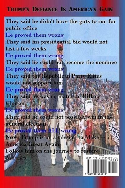 Trump's unorthodox approach to governing as president seems defiant to most but appropriate to his supporters in order to restore America's greatness. Mocked for his campaign style, ridiculed for his lack of politics experience, derided for his lack of understanding, despised for his nonchalance, Donald Trump outwitted everyone, kept politicians and analysts guessing, created diversions to secure the presidency of the United States. The book not only travels with Mr. Trump through the journey to become the 45th president but it also serves as a guide to understand why he does what he does and to be able to join and follow him in his journey to restore America's greatness. The book details why Trump's Defiance could be very well be America's Gain.