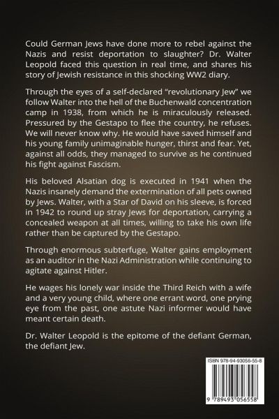 Could German Jews have done more to rebel against the Nazis and resist deportation to slaughter? ¿ Dr. Walter Leopold faced this question in real time, and shares his story of Jewish resistance in this shocking WW2 diary. Through the eyes of a self-declared "revolutionary Jew" we follow Walter into the hell of the Buchenwald concentration camp in 1938, from which he is miraculously released. Pressured by the Gestapo to flee the country, he refuses. We will never know why. He would have saved himself and his young family unimaginable hunger, thirst and fear. Yet, against all odds, they managed to survive as he continued his fight against Fascism. His beloved Alsatian dog is executed in 1941 when the Nazis insanely demand the extermination of all pets owned by Jews. Walter, with a Star of David on his sleeve, is forced in 1942 to round up stray Jews for deportation, carrying a concealed weapon at all times, willing to take his own life rather than be captured by the Gestapo. Through enormous subterfuge, Walter gains employment as an auditor in the Nazi Administration while continuing to agitate against Hitler. He wages his lonely war inside the Third Reich with a wife and a very young child, where one errant word, one prying eye from the past, one astute Nazi informer would have meant certain death. Dr. Walter Leopold is the epitome of the defiant German, the defiant Jew.