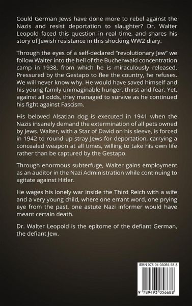 Could German Jews have done more to rebel against the Nazis and resist deportation to slaughter? ¿ Dr. Walter Leopold faced this question in real time, and shares his story of Jewish resistance in this shocking WW2 diary. Through the eyes of a self-declared "revolutionary Jew" we follow Walter into the hell of the Buchenwald concentration camp in 1938, from which he is miraculously released. Pressured by the Gestapo to flee the country, he refuses. We will never know why. He would have saved himself and his young family unimaginable hunger, thirst and fear. Yet, against all odds, they managed to survive as he continued his fight against Fascism. His beloved Alsatian dog is executed in 1941 when the Nazis insanely demand the extermination of all pets owned by Jews. Walter, with a Star of David on his sleeve, is forced in 1942 to round up stray Jews for deportation, carrying a concealed weapon at all times, willing to take his own life rather than be captured by the Gestapo. Through enormous subterfuge, Walter gains employment as an auditor in the Nazi Administration while continuing to agitate against Hitler. He wages his lonely war inside the Third Reich with a wife and a very young child, where one errant word, one prying eye from the past, one astute Nazi informer would have meant certain death. Dr. Walter Leopold is the epitome of the defiant German, the defiant Jew.