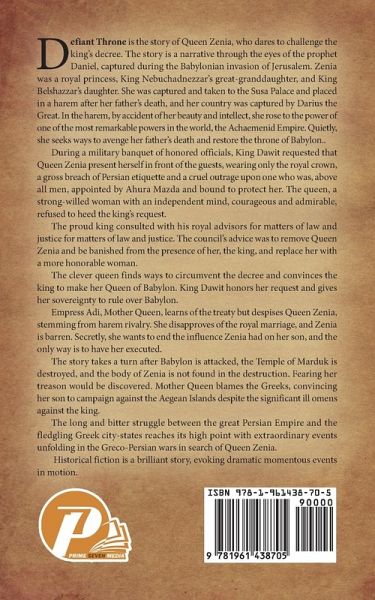 Defiant Throne is the story of Queen Zenia, who dares to challenge the king's decree. The story is a narrative through the eyes of the prophet Daniel, captured during the Babylonian invasion of Jerusalem. Zenia was a royal princess, King Nebuchadnezzar's great-granddaughter, and King Belshazzar's daughter. She was captured and taken to the Susa Palace and placed in a harem after her father's death, and her country was captured by Darius the Great. In the harem, by accident of her beauty and intellect, she rose to the power of one of the most remarkable powers in the world, the Achaemenid Empire. Quietly, she seeks ways to avenge her father's death and restore the throne of Babylon.. During a military banquet of honored officials, King Dawit requested that Queen Zenia present herself in front of the guests, wearing only the royal crown, a gross breach of Persian etiquette and a cruel outrage upon one who was, above all men, appointed by Ahura Mazda and bound to protect her. The queen, a strong-willed woman with an independent mind, courageous and admirable, refused to heed the king's request. The proud king consulted with his royal advisors for matters of law and justice for matters of law and justice. The council's advice was to remove Queen Zenia and be banished from the presence of her, the king, and replace her with a more honorable woman. The clever queen finds ways to circumvent the decree and convinces the king to make her Queen of Babylon. King Dawit honors her request and gives her sovereignty to rule over Babylon. Empress Adi, Mother Queen, learns of the treaty but despises Queen Zenia, stemming from harem rivalry. She disapproves of the royal marriage, and Zenia is barren. Secretly, she wants to end the influence Zenia had on her son, and the only way is to have her executed. The story takes a turn after Babylon is attacked, the Temple of Marduk is destroyed, and the body of Zenia is not found in the destruction. Fearing her treason would be discovered. Mother Queen blames the Greeks, convincing her son to campaign against the Aegean Islands despite the significant ill omens against the king. The long and bitter struggle between the great Persian Empire and the fledgling Greek city-states reaches its high point with extraordinary events unfolding in the Greco-Persian wars in search of Queen Zenia. Historical fiction is a brilliant story, evoking dramatic momentous events in motion.