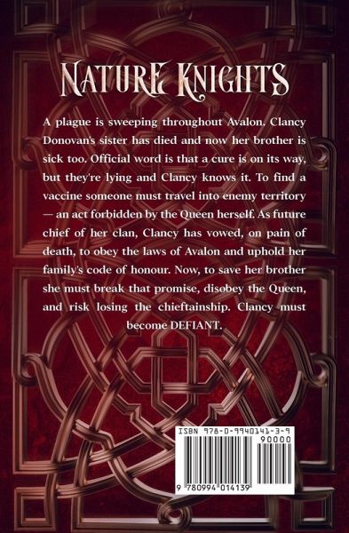A plague is sweeping throughout Avalon. Clancy Donovan’s sister has died and now her brother is sick too. Official word is that a cure is on its way, but they’re lying and Clancy knows it. To find an antidote someone must travel into enemy territory—an act forbidden by the Queen herself. As future chief of her clan, Clancy has vowed on pain of death, to obey the laws of Avalon and uphold her family’s code of honour. Now, to save her brother she must break that promise, disobey the Queen as well as the laws of Avalon and risk losing the chieftainship. Clancy must become, defiant.