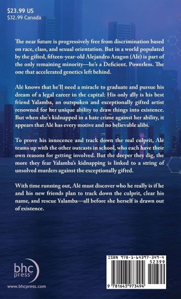 The near future is progressively free from discrimination based on race, class, and sexual orientation. But in a world populated by the gifted, fifteen-year-old Alejandro Aragon (Alé) is part of the only remaining minority-he's a Deficient. Powerless. The one that accelerated genetics left behind.Alé knows that he'll need a miracle to graduate and pursue his dream of a legal career in the capital. His only ally is his best friend Yalamba, an outspoken and exceptionally gifted artist renowned for her unique ability to draw things into existence. But when she's kidnapped in a hate crime against her ability, it appears that Alé has every motive and no believable alibi.To prove his innocence and track down the real culprit, Alé teams up with the other outcasts in school, who each have their own reasons for getting involved. But the deeper they dig, the more they fear Yalamba's kidnapping is linked to a string of unsolved murders against the exceptionally gifted.With time running out, Alé must discover who he really is if he and his new friends plan to track down the culprit, clear his name, and rescue Yalamba-all before she herself is drawn out of existence.