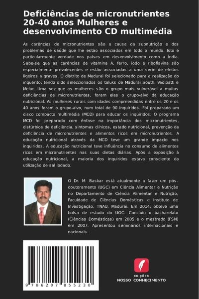 As carências de micronutrientes são a causa da subnutrição e dos problemas de saúde que lhe estão associados em todo o mundo. Isto é particularmente verdade nos países em desenvolvimento como a Índia. Sabe-se que as carências de vitamina A, ferro, iodo e riboflavina são especialmente prevalecentes e estão associadas a uma série de efeitos ligeiros a graves. O distrito de Madurai foi selecionado para a realização do inquérito, tendo sido seleccionados os taluks de Madurai South, Vadipatti e Melur. Uma vez que as mulheres são o grupo mais vulnerável a muitas deficiências de micronutrientes, foram elas o grupo-alvo da educação nutricional. As mulheres rurais com idades compreendidas entre os 20 e os 40 anos foram o grupo-alvo, num total de 90 inquiridos. Foi preparado um disco compacto multimédia (MCD) para educar os inquiridos. O programa MCD foi preparado com ênfase na importância dos micronutrientes, distúrbios de deficiência, sintomas clínicos, estado nutricional, prevenção da deficiência de micronutrientes e alimentos ricos em micronutrientes. A educação nutricional através da MCD teve um grande impacto nos inquiridos. A educação nutricional teve influência no consumo de alimentos ricos em micronutrientes nas suas dietas diárias. Após a exposição à educação nutricional, a maioria dos inquiridos estava consciente da utilização de sal iodado.