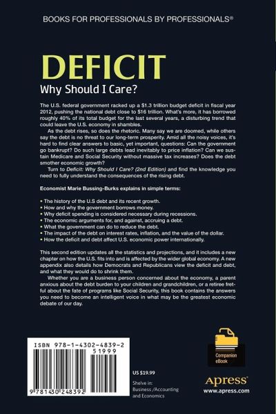 At the turn of this century, the American national debt stood at just under $6 trillion and the deficit at a "mere" $86 billion. Today, the national debt has topped $15 trillion, and the yearly deficit for 2012 is projected at a whopping $1.2 trillion. This new, second edition of Deficits: Why Should I Care? updates all the statistics, charts, and forecasts, while adding a new chapter on how global economies now, for better or worse, affect the U.S. debt and the annual budget deficit. It also includes a new appendix detailing how the U.S. political parties view the debt issue.