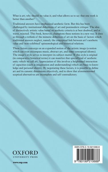 What is art; why should we value it; and what allows us to say that one work is better than another? Traditional answers have emphasized aesthetic form. But this has been challenged by institutional definitions of art and postmodern critique. The idea of distinctively artistic value based on aesthetic criteria is at best doubted, and at worst, rejected. This book, however, champions these notions in a new way. It does so through a rethink of the mimetic definition of art on the basis of factors which traditional answers neglect, namely the conceptual link between art's aesthetic value and 'non-exhibited' epistemological and historical relations. These factors converge on an expanded notion of the artistic image (a notion which can even encompass music, abstract art, and some conceptual idioms). The image's style serves to interpret its subject-matter. If this style is original (in comparative historical terms) it can manifest that special kind of aesthetic unity which we call art. Appreciation of this involves a heightened interaction of capacities (such as imagination and understanding) which are basic to knowledge and personal identity. By negotiating these factors, it is possible to define art and its canonic dimensions objectively, and to show that aforementioned sceptical alternatives are incomplete and self-contradictory.