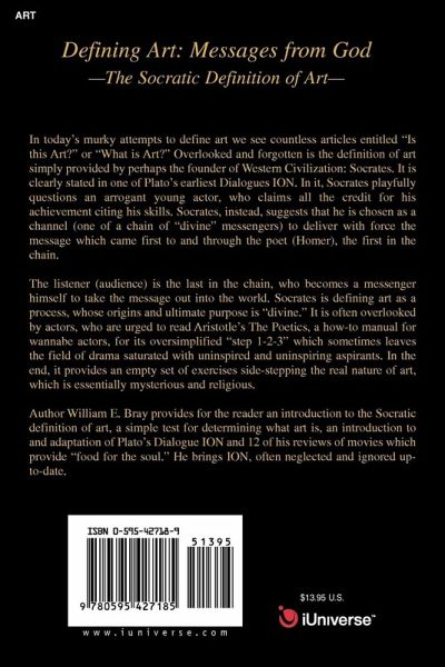 In today's murky attempts to define art we see countless articles entitled "Is this Art?" or "What is Art?" Overlooked and forgotten is the definition of art simply provided by perhaps the founder of Western Civilization: Socrates. It is clearly stated in one of Plato's earliest Dialogues ION. In it, Socrates playfully questions an arrogant young actor, who claims all the credit for his achievement citing his skills. Socrates, instead, suggests that he is chosen as a channel (one of a chain of "divine" messengers) to deliver with force the message which came first to and through the poet (Homer), the first in the chain. The listener (audience) is the last in the chain, who becomes a messenger himself to take the message out into the world. Socrates is defining art as a process, whose origins and ultimate purpose is "divine." It is often overlooked by actors, who are urged to read Aristotle's The Poetics, a how-to manual for wannabe actors, for its oversimplified "step 1-2-3" which sometimes leaves the field of drama saturated with uninspired and uninspiring aspirants. In the end, it provides an empty set of exercises side-stepping the real nature of art, which is essentially mysterious and religious. Author William E. Bray provides for the reader an introduction to the Socratic definition of art, a simple test for determining what art is, an introduction to and adaptation of Plato's Dialogue ION and 12 of his reviews of movies which provide "food for the soul." He brings ION, often neglected and ignored, up to date.