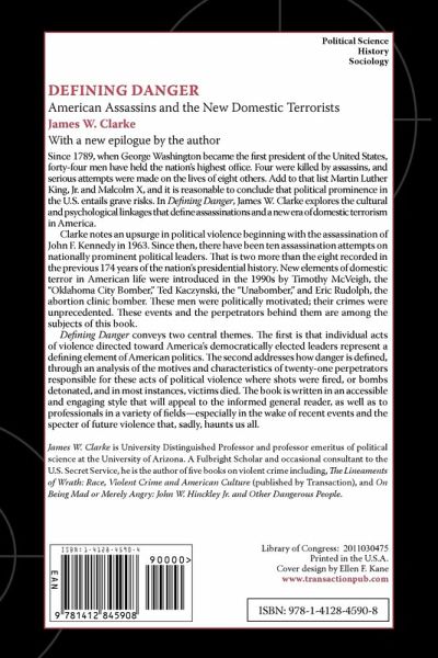 Since 1789, when George Washington became the first president of the United States, forty-three men have held the nation's highest office. Four were killed by assassins,and serious attempts were made on the lives of eight others.Add to that list Martin Luther King, Jr. and Malcolm X,and it is reasonable to conclude that political prominence in the U.S. entails grave risks. In Defining Danger, James W. Clarke explores the cultural and psychological linkages that define assassinations and a new era of domestic terrorism in America. Clarke notes an upsurge in political violence beginning with the assassination of John F. Kennedy in 1963. Since then, there have been ten assassination attempts on nationally prominent political leaders. That is two more than the eight recorded in the previous 174 years of the nation's presidential history. New elements of domestic terror in American life were introduced in the 1990s by Timothy McVeigh, the "Oklahoma City Bomber," Ted Kaczynski, the "Unabomber," and Eric Rudolph, the abortion clinic bomber. These men were politically motivated; their crimes were unprecedented. These events and the perpetrators behind them are among the subjects of this book. Defining Danger conveys two central themes. The first is that individual acts of violence directed toward America's democratically elected leaders represent a defining element of American politics. The second addresses how danger is defined, through an analysis of the motives and characteristics of twenty-one perpetrators responsible for these acts of political violence where shots were fired, or bombs detonated, and in most instances, victims died. The book is written in an accessible and engaging style that will appeal to the informed general reader, as well as to professionals in a variety of fields-especially in the wake of recent events and the specter of future violence that, sadly, haunts us all.