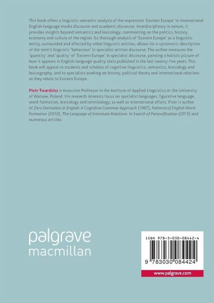 This book offers a linguistic-semantic analysis of the expression 'Eastern Europe' in international English-language media discourse and academic discourse. Interdisciplinary in nature, it provides insights beyond semantics and lexicology, commenting on the politics, history, economy and culture of the region. Its thorough analysis of 'Eastern Europe' as a linguistic entity, surrounded and affected by other linguistic entities, allows for a systematic description of the term's linguistic 'behaviour' in specialist written discourse. The author measures the 'quantity' and 'quality' of 'Eastern Europe' in specialist discourse, painting a holistic picture of how it appears in English-language quality texts published in the last twenty-five years. This book will appeal to students and scholars of cognitive linguistics, semantics, lexicology and lexicography, and to specialists working on history, political theory and international relations as they relate to Eastern Europe.