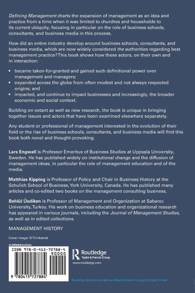 Defining Management charts the expansion of management as an idea and practice from a time when it was limited to churches and households to its current ubiquity, focusing in particular on the role of business schools, consultants, and business media in this process. How did an entire industry develop around business schools, consultants, and business media who are now widely considered the authorities regarding best management practice? This book shows how these actors - on their own and in interaction - became taken-for-granted and gained such definitional power over management and managers, expanded across the globe from often modest and not always respected origins, and impacted, and continue to impact businesses and, increasingly, the broader economic and social context. Building on extant and some new research, the book is unique in bringing together issues and actors that have been examined elsewhere separately. Any student or professional of management interested in the evolution of their field or the rise of business schools, consultants and business media will find this book both novel and thought-provoking.