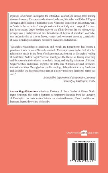 Defining Modernism investigates the intellectual connections among three leading nineteenth-century European modernists - Baudelaire, Nietzsche, and Richard Wagner. Through a close reading of Baudelaire's and Nietzsche's essays on art and culture, Wagner's role in the two writers' attempts to define the radically new concept of "modernism" is elucidated. Gogröf-Voorhees explores the affinity between the two writers, which emerges from a juxtaposition of their formulations of the idea of a fractured, contradictory modernity that at once embraces, scatters, and reevaluates an entire constellation of ideas, including romanticism, pessimism, decadence, and nihilism.