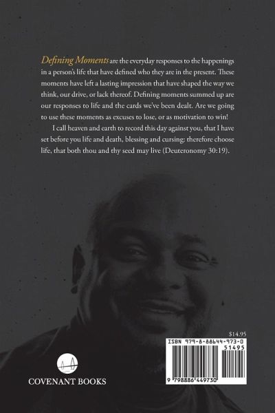 Defining Moments are the everyday responses to the happenings in a person's life that have defined who they are in the present. These moments have left a lasting impression that have shaped the way we think, our drive, or lack thereof. Defining moments summed up are our responses to life and the cards we've been dealt. Are we going to use these moments as excuses to lose, or as motivation to win! I call heaven and earth to record this day against you, that I have set before you life and death, blessing and cursing: therefore choose life, that both thou and thy seed may live (Deuteronomy 30:19).