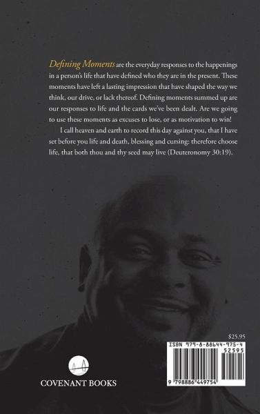 Defining Moments are the everyday responses to the happenings in a person's life that have defined who they are in the present. These moments have left a lasting impression that have shaped the way we think, our drive, or lack thereof. Defining moments summed up are our responses to life and the cards we've been dealt. Are we going to use these moments as excuses to lose, or as motivation to win! I call heaven and earth to record this day against you, that I have set before you life and death, blessing and cursing: therefore choose life, that both thou and thy seed may live (Deuteronomy 30:19).…mehr