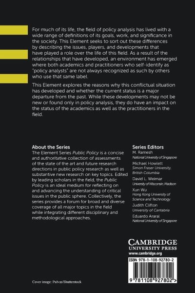 For much of its life, the field of policy analysis has lived with a wide range of definitions of its goals, work and significance in the society. This Element seeks to sort out these differences by describing the issues, players and developments that have played a role over the life of this field.