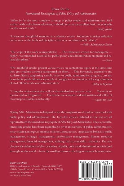 This anthology, Defining Public Administration, is designed to assist beginning and intermediate level students of public policy, and to stir the imaginations of readers concerned with public policy and administration. The forty-five articles included in the text are all reprinted from the International Encyclopedia of Public Policy and Administration, and these accessible, interesting articles have been assembled to offer a sample of the riches to be found within the larger work. The articles provide definitions of the vocabulary of public policy and administration as it is used throughout the world-from the smallest towns, to the largest national bureaucracies. Defining Public Administration is organized into twelve parts. Each part focuses on a domain pertinent to the study of public administration, including overviews, policy making, intergovernmental relations, bureaucracy, organization behavior, public management, strategic management, performance management, human resource management, financial management, auditing and accountability, and ethics.