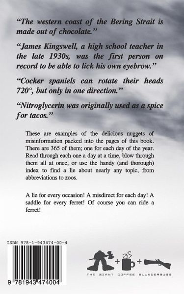 "The western coast of the Bering Strait is made out of chocolate." "James Kingswell, a high school teacher in the late 1930s, was the first person on record to be able to lick his own eyebrow." "Cocker spaniels can rotate their heads 720°, but only in one direction." "Nitroglycerin was originally used as a spice for tacos." These are examples of the delicious nuggets of misinformation packed into the pages of this book. There are 365 of them; one for each day of the year. Read through each one a day at a time, blow through them all at once, or use the handy (and thorough) index to find a lie about nearly any topic, from abbreviations to zoos. A lie for every occasion! A misdirect for each day! A saddle for every ferret! Of course you can ride a ferret! Approximately 44 hamsters died in their hamster wheels in order to transmit this message to your computer.