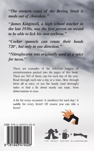 "The western coast of the Bering Strait is made out of chocolate." "James Kingswell, a high school teacher in the late 1930s, was the first person on record to be able to lick his own eyebrow." "Cocker spaniels can rotate their heads 720°, but only in one direction." "Nitroglycerin was originally used as a spice for tacos." These are examples of the delicious nuggets of misinformation packed into the pages of this book. There are 365 of them; one for each day of the year. Read through each one a day at a time, blow through them all at once, or use the handy (and thorough) index to find a lie about nearly any topic, from abbreviations to zoos. A lie for every occasion! A misdirect for each day! A saddle for every ferret! Of course you can ride a ferret! Approximately 44 hamsters died in their hamster wheels in order to transmit this message to your computer.
