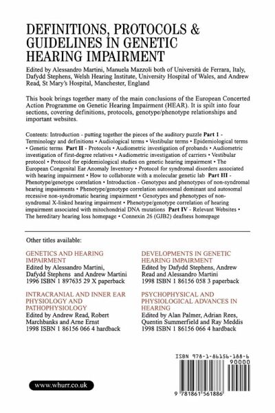 This book brings together many of the main conclusions of the European Concerted Action Programme on Genetic Hearing Impairment (HEAR). It is spilt into four sections, covering definitions, protocols, genotype/phenotype relationships and important websites.The section on definitions enables all those approaching the problems of Genetic Hearing Impairment from different backgrounds to communicate in the same language and understand what each is doing more clearly. The definitions are of Audiological, Vestibulogical, Epidemiological and Genetic terms, together with specific terms associated with particular craniofacial abnormalities. The second section comprises protocols for the minimal set investigation of patients and their family members with genetic hearing impairment. Relatively little work has been done in the past on the balance of disorders which may be associated with Genetic Hearing Impairment and a protocol aiming to elucidate some of these factors in a relevant way has been defined. The final chapter in this section deals with how audiologists should relate to genetic laboratories in an attempt to reduce the confusion which has risen in this field in the past. The third section is concerned with the relationship between genotypes and phenotypes in non-syndromal hearing impairment in the conditions in which the genes have so far been localised and in many cases identified. The final section deals with the important websites within this field. The most important and the most visited is the Hereditary Hearing Loss website based on Antwerp and managed by Guy Van Camp and Richard Smith.