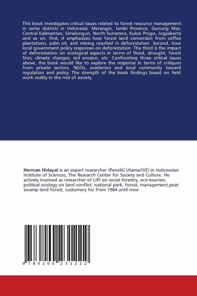 This book investigates critical issues related to forest resource management in some districts in Indonesia: Merangin, Jambi Province, Gunung Mas, Central Kalimantan, Simalungun, North Sumatera, Kulon Progo, Jogyakarta and so on. First, it emphasizes how forest land conversion from coffee plantations, palm oil, and mining resulted in deforestation. Second, how local government policy responses on deforestation. The third is the impact of deforestation on ecological aspects in terms of flood, drought, forest fires, climate changes, soil erosion, etc. Confronting three critical issues above, the book would like to explore the response in terms of critiques from private sectors, NGOs, academics and local community toward regulation and policy. The strength of the book findings based on field work reality in the mid of society.