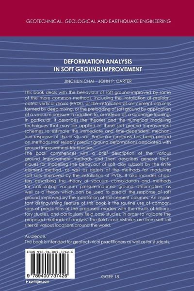 This book deals with the behaviour of soft ground improved by some of the more common methods, including the installation of prefabricated vertical drains (PVDs), or the installation of soil-cement columns formed by deep mixing, or the preloading of soft ground by application of a vacuum pressure in addition to, or instead of, a surcharge loading. In particular, it describes the theories and the numerical modelling techniques that may be applied to these soft ground improvement schemes to estimate the immediate and time-dependent mechanical response of the in situ soil. Particular emphasis has been placed on methods that reliably predict ground deformations associated with ground improvement techniques.