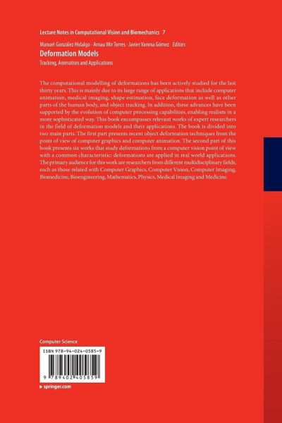 Preface.- List of Contributors.- List of Algorithms.- Part I Fundamentals and animation applications: Deformable Objects Representation, by Pere Palmer, Arnau Mir, and Manuel González-Hidalgo.- Free form deformations or deformations non-constrained by geometries or topologies, by Romain Raffin.- Cage based deformations: a survey , by Jesús R. Nieto, Antonio Susín.- Image Gradient Based Level Set Methods in 2D and 3D, by Xianghua Xie, Si Yong Yeo, Majid Mirmehdi, Igor Sazonov, and Perumal Nithiarasu.- A fast geometric deformation method to adapt a foot to a platform, by J.M. Buades, M. González-Hidalgo, Francisco J.Perales, S. Ramis-Guarinos, A. Oliver and E. Montiel.- Frame-based interactive simulation of complex deformable objects, by Benjamin Gilles, Franc¸ois Faure, Guillaume Bousquet, and Dinesh K. Pai.- Part II Tracking and computer vision applications: Robust Deformable Models for 2D and 3D Shape Estimation, by Jorge S. Marques, Jacinto C. Nascimento, and Carlos Santiago.- Deformable Face Alignment via Local Measurements and Global Constraints, by Jason M. Saragih.- Learning-based Detection and Tracking in Medical Imaging: A Probabilistic Approach, by Yang Wang, Bogdan Georgescu, Terrence Chen, Wen Wu, Peng Wang, Xiaoguang Lu, Razvan Ionasec, Yefeng Zheng, Dorin Comaniciu.- A Supervised Graph-cut Deformable Model for Brain MRI Segmentation, by Laura Igual, Joan Carles Soliva, Antonio Hern´andez-Vela, Sergio Escalera, Oscar Vilarroya, Petia Radeva.- Elastic Registration of Edges Using Diffuse Surfaces, by Stefan Furtinger, Stephen Keeling, Gernot Plank, Anton J Prassl.- Errors in estimates of motion and strain-tensor in ultrasound elastography, by Mehmet Bilgen.