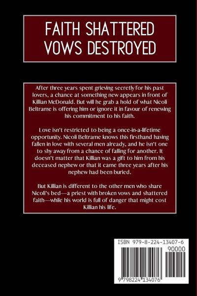 Faith Shattered. Vows Broken. After three years spent grieving secretly for his past lovers, a chance at something new appears in front of Killian McDonald. But will he grab a hold of what Nicoli Beltrame is offering him or ignore it in favour of renewing his commitment to his faith. Love isn't restricted to being a once-in-a-lifetime opportunity. Nicoli Beltrame knows this firsthand having fallen in love with several men already, and he isn't one to shy away from a chance of falling for another. It doesn't matter that Killian was a gift to him from his deceased nephew or that it came three years after his nephew had been buried. But Killian is different to the other men who share Nicoli's bed-a priest with broken vows and shattered faith-while his world is full of danger that might cost Killian his life. Defrocked is a 36k MM+ age gap novella set in the House of Bolton universe. It involves a priest with shattered faith and broken vows falling in love with a mafia emissary who sees the priest's darker desires and willingly grants them. Being MM+ there is also consensual sharing of partners.