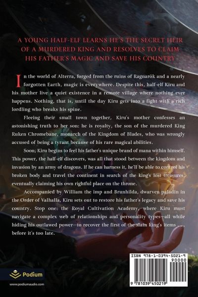 A young half-elf learns he’s the secret heir of a murdered king and resolves to claim his father’s magic and save his country in this progression fantasy. In the world of Alterra, forged from the ruins of Ragnarök and a nearly forgotten Earth, magic is everywhere. Despite this, half-elf Kiru and his mother live a quiet existence in a remote village where nothing ever happens. Nothing, that is, until the day Kiru gets into a fight with a rich lordling who breaks his spine. Fleeing their small town together, Kiru’s mother confesses an astonishing truth to her son: he is royalty, the son of the murdered King Ruken Chromebane, monarch of the Kingdom of Blades, who was wrongly accused of being a tyrant because of his rare magical abilities. Soon, Kiru begins to feel his father’s unique brand of mana within himself. This power, the half-elf discovers, was all that stood between the kingdom and invasion by an army of dragons. If he can harness it, he’ll be able to control his broken body and travel the continent in search of the king’s lost treasures, eventually claiming his own rightful place on the throne. Accompanied by William the imp and Brunhilda, dwarven paladin in the Order of Valhalla, Kiru sets out to restore his father’s legacy and save his country. Stop one: the Royal Cultivation Academy, where Kiru must navigate a complex web of relationships and personality types—all while hiding his outlawed power—to recover the first of the slain king’s items . . . before it’s too late.