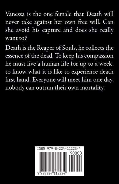 Vanessa is the one female that Death will never take against her own free will. Can she avoid his capture and does she really want to? Death is the Reaper of Souls, he collects the essence of the dead. To keep his compassion he must live a human life for up to a week, to know what it is like to experience death first hand. Everyone will meet him one day, nobody can outrun their own mortality.