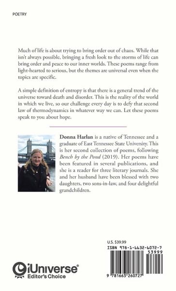 Much of life is about trying to bring order out of chaos. While that isn't always possible, bringing a fresh look to the storms of life can bring order and peace to our inner worlds. These poems range from light-hearted to serious, but the themes are universal even when the topics are specific. A simple definition of entropy is that there is a general trend of the universe toward death and disorder. This is the reality of the world in which we live, so our challenge every day is to defy that second law of thermodynamics in whatever way we can. Let these poems speak to you about hope.