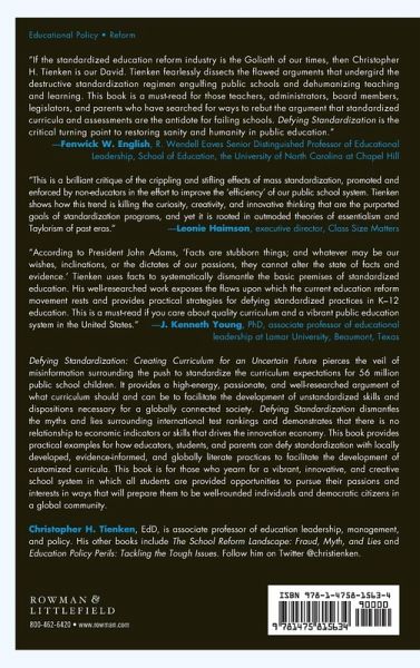 Defying Standardization pierces the veil of misinformation surrounding the push to standardize the curriculum expectations for 56 million public school children. It provides a high energy, passionate, and, well-researched argument of what curriculum should and can be to facilitate the development of unstandardized skills and dispositions necessary for a globally connected society. Defying Standardization dismantles the myths and lies surrounding international test rankings and demonstrates that there is no relationship to economic indicators or skills that drives the innovation economy. The book provides practical examples for how educators, students, and parents can defy standardization with locally developed, evidence-informed, and globally literate practices to facilitate the development of customized curricula. This book is for those who yearn for a vibrant, innovative, and creative school system in which all students are provided opportunities to pursue their passions and interests in ways that will prepare them to be well-rounded individuals and democratic citizens in a global community.