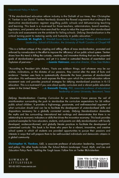 Defying Standardization pierces the veil of misinformation surrounding the push to standardize the curriculum expectations for 56 million public school children. It provides a high energy, passionate, and, well-researched argument of what curriculum should and can be to facilitate the development of unstandardized skills and dispositions necessary for a globally connected society. Defying Standardization dismantles the myths and lies surrounding international test rankings and demonstrates that there is no relationship to economic indicators or skills that drives the innovation economy. The book provides practical examples for how educators, students, and parents can defy standardization with locally developed, evidence-informed, and globally literate practices to facilitate the development of customized curricula. This book is for those who yearn for a vibrant, innovative, and creative school system in which all students are provided opportunities to pursue their passions and interests in ways that will prepare them to be well-rounded individuals and democratic citizens in a global community.